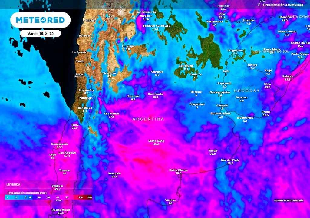 Las tormentas pueden ser localmente fuertes, con fenómenos asociados como abundante caída de agua en cortos períodos, ráfagas intensas de viento, actividad eléctrica frecuente y ocasional caída de granizo. Se estiman acumulados de precipitación entre 20 mm y 40 mm, aunque en algunos sectores podrían superarse estos valores.