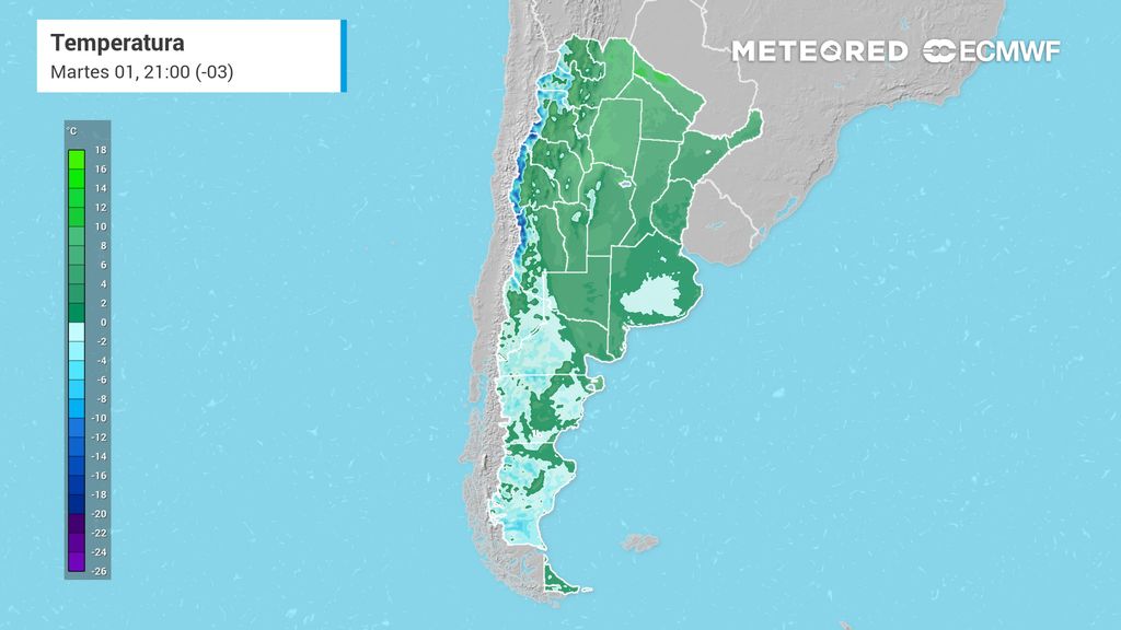 De acuerdo con nuestro modelo de referencia, el ECMWF, recién hacia el jueves se espera un leve ascenso de las temperaturas, que volverán a aproximarse a los promedios normales de julio. Hasta entonces, se mantendrán valores mínimos muy bajos, con heladas generalizadas y riesgo de nuevas marcas extremas en sectores de la Patagonia y del centro del país.