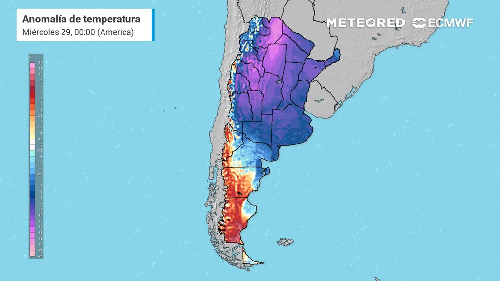 El fenómeno, de origen marítimo, provoca un descenso térmico muy marcado, con valores mínimos que en la provincia de Buenos Aires y en el este de La Pampa podrían ubicarse entre 0 °C y 2 °C. En el sudoeste bonaerense, las temperaturas llegarán a valores cercanos a 0 ºC o incluso -1 ºC, siendo el núcleo más frío de todo el evento.