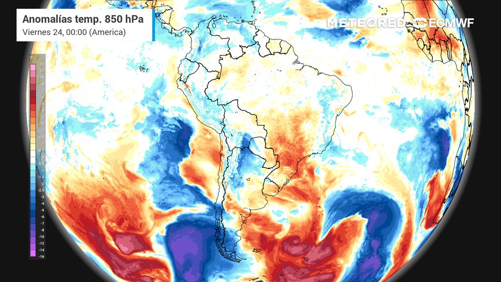 Más allá de las precipitaciones, lo más relevante será el marcado descenso de las temperaturas. Las máximas caerán a valores de entre 16 °C y 20 °C en la región central y entre 8 °C y 12 °C en la Patagonia, evidenciando el avance del aire frío post-frontal.