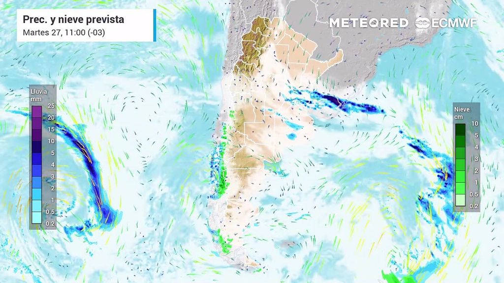 Por otro lado, cabe destacar que, si bien las condiciones irán mejorando progresivamente, todavía durante este martes pueden observarse algunas nevadas débiles y aisladas en la región cordillerana de la Patagonia y la provincia de Mendoza.
