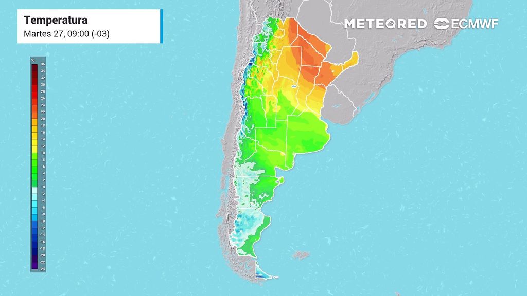 Con el pasaje de un sistema frontal frío se prevé la rotación del viento al sector sur, lo que promoverá el ingreso de aire frío a la porción central del país. Este pronunciado descenso quedará acotado especialmente a la franja central de Argentina, en particular el centro y sur de Cuyo y gran parte de la zona pampeana.