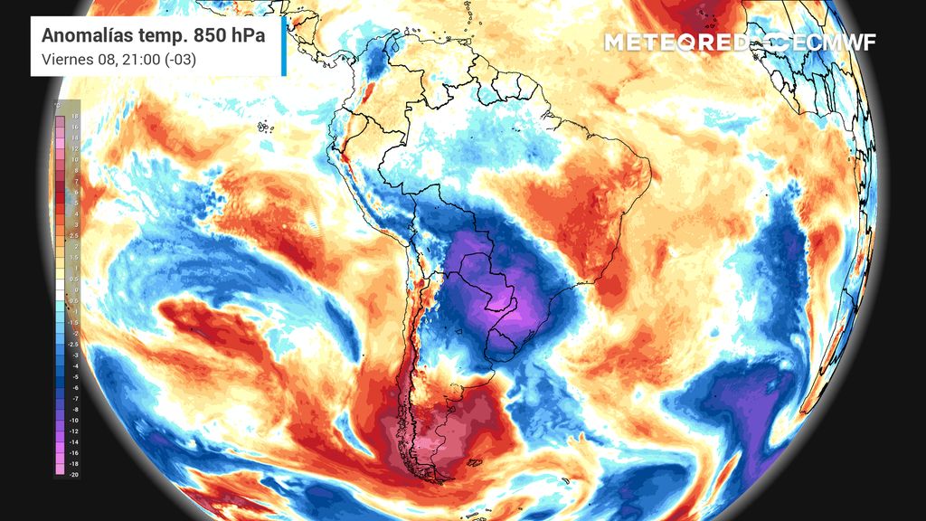 Durante la segunda mitad de esta semana se espera un marcado refuerzo del aire frío que provocará un descenso térmico generalizado en todo el centro y norte del país. Este pulso de aire más seco y de origen polar también alcanzará a países vecinos como Paraguay, Uruguay y el sur de Brasil. Las condiciones de estabilidad atmosférica dominarán gran parte del territorio nacional, con escasa nubosidad, lo cual contribuirá a un mayor enfriamiento, especialmente durante las noches y madrugadas.