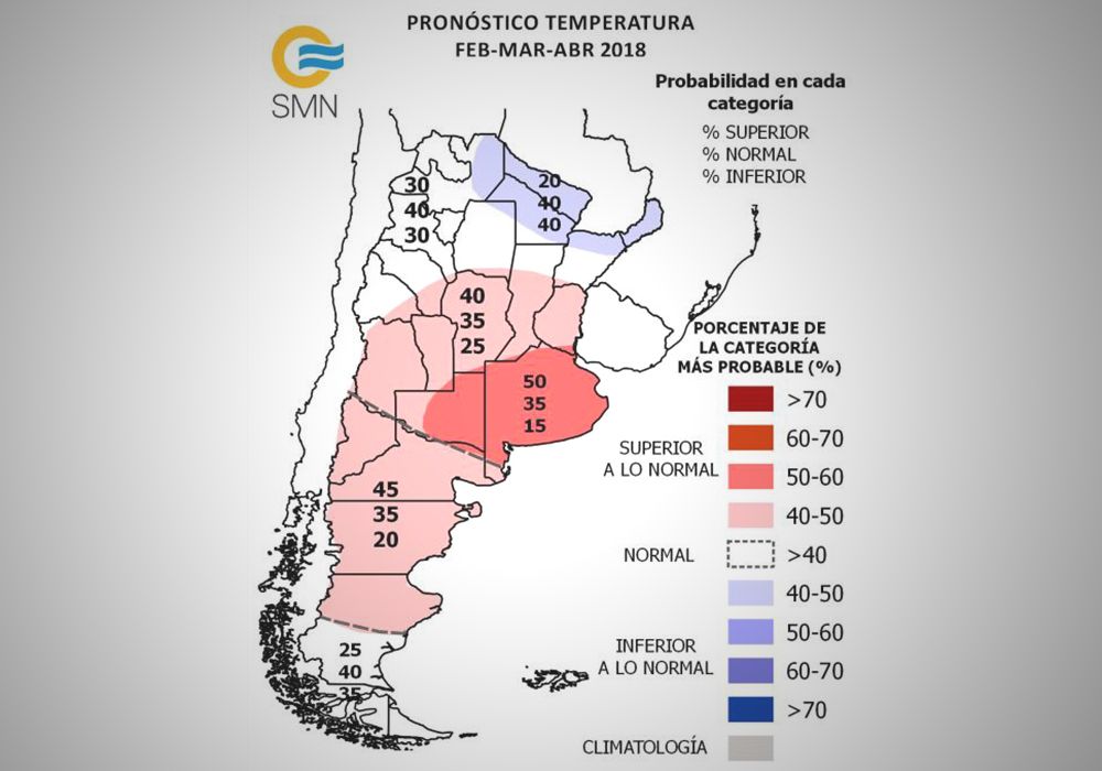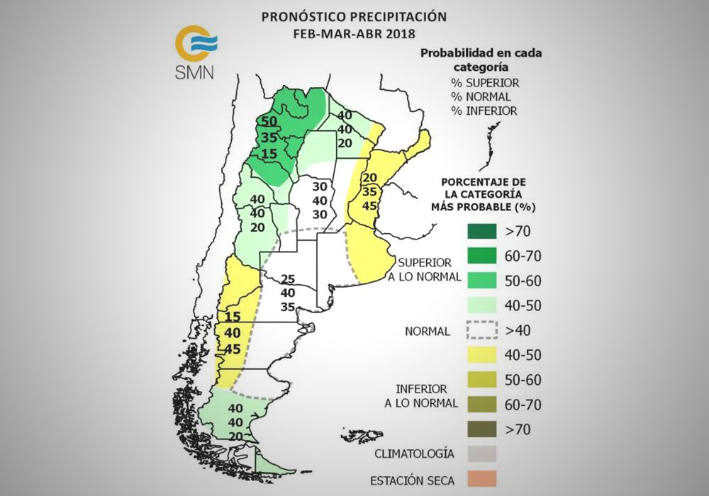 El informe oficial prevé para el trimestre febrero-marzo-abril una mayor probabilidad (45%) de ocurrencia de precipitación inferior a la normal sobre las provincias del litoral y centro-este de Buenos Aires. Sumado a que La Pampa y el oeste de Buenos Aires presentarían precipitaciones normales o por debajo de lo normal, y que Córdoba y el oeste de Santa Fe mostrarían lluvias normales, se puede concluir que la mayor zona productiva de la Argentina seguirá mostrando un panorama complejo. El déficit de agua que viene siendo notorio en los últimos meses podría acentuarse en amplias zonas del centro de Argentina, en tanto que aquellos sectores que muestren lluvias normales podrían revertir en cierto grado el mal estado que en líneas generales presentan los suelos de la región.