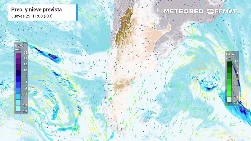 En tanto, durante el fin de semana, se prevé que vuelvan a registrarse nevadas de variada intensidad en la zona cordillerana de la Patagonia argentina, especialmente sobre las provincias de Neuquén, Río Negro y el norte de Chubut, zona que podría tener nuevamente eventos de moderada a fuerte intensidad, particularmente durante el domingo.