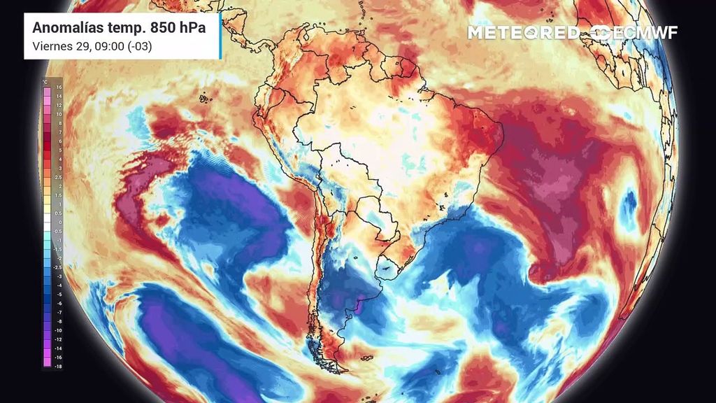 En la mañana del viernes destacaba un sistema frontal frío avanzando por la región central de la Argentina, secundado por un centro de altas presiones ubicado sobre el norte patagónico.