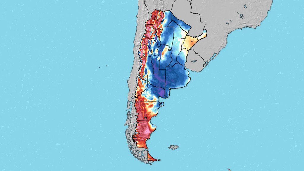 Esto también da lugar al avance de la masa de aire frío que ya está instalada sobre la porción central del país, pero que ahora también comienza a avanzar hacia el norte, provocando una significativa disminución de las marcas térmicas sobre toda la franja norte del país.