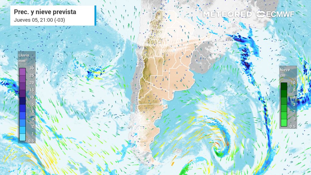 Por un lado, se destacan las nevadas previstas en el sector cordillerano de la Patagonia norte, con acumulados importantes para la zona. Por otro, se espera un episodio de tormentas intensas en el noreste del país, especialmente sobre la provincia de Misiones y el extremo noreste de Corrientes, con lluvias abundantes, ráfagas y posibilidad de granizo.