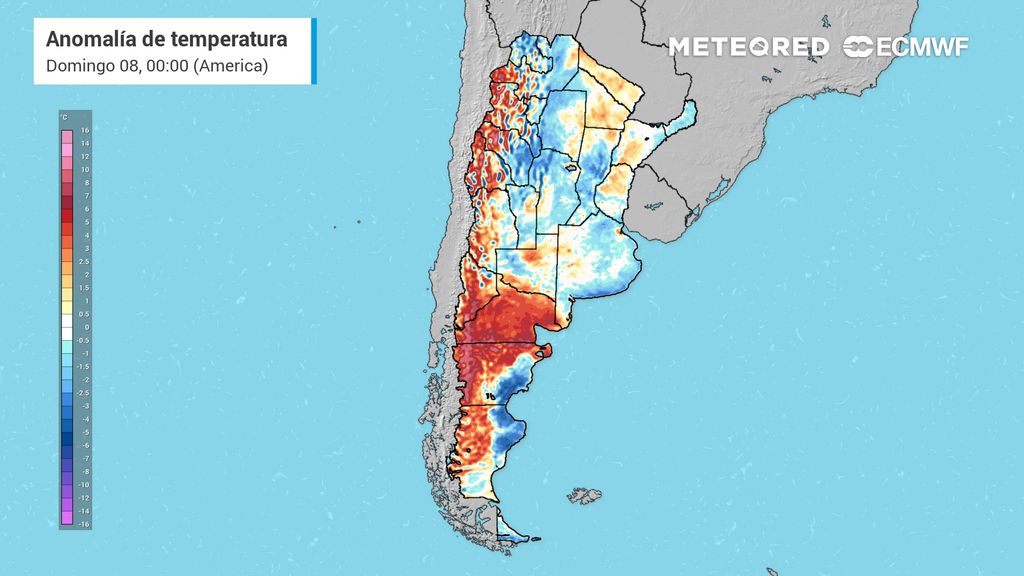 Durante el domingo, la situación comenzará a revertirse con el establecimiento del viento del sector norte. Esta configuración favorecerá una recuperación térmica generalizada, con temperaturas nuevamente elevadas en gran parte del territorio nacional. Este ascenso, será temporario y no mostrará características extremas.